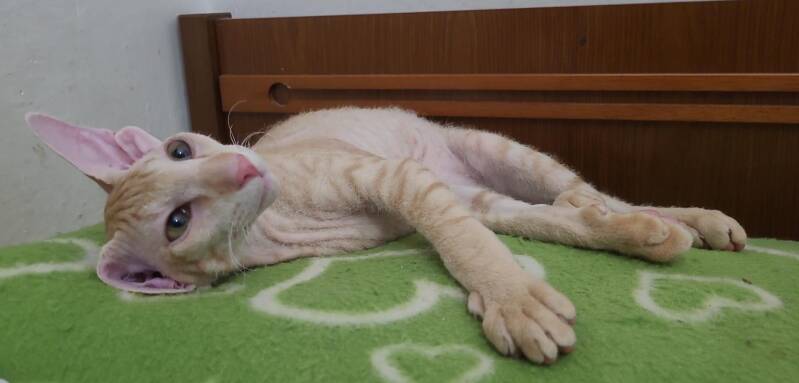 Arrivée récemment dans le concert des nations félinotechniques, la Russie se devait d’avoir ses races félines. L’histoire du Peterbald commence en 1994 à St Petersbourg sous l’impulsion d’Olga S. Mironova avec l’union d’un mâle Donskoy, race de chats nus découverte et sélectionnée à Rostov sur le Don à la fin des années 1980, et d’une chatte Orientale. L’idée d’Olga était de combiner la grâce et l’élégance de l’Oriental avec la peau de pêche du Donskoy. La fourrure ultra courte du Peterbald était en effet un moyen de mettre en valeur la morphologie et le type Oriental. Pas de poil superflu qui masque l’élégance d’une encolure ou épaissit une queue ! Petit à petit, les mariages avec les Donskoy furent donc interdits pour ne plus autoriser que ceux avec des Siamois et des Orientaux. Un premier standard fut rédigé en 1996 par la Russian Selectional Feline Federation. Le Peterbald, nommé d’après Pierre le Grand, tsar fondateur de St Petersbourg, est aujourd’hui accepté par les plus grandes fédérations félines internationales.